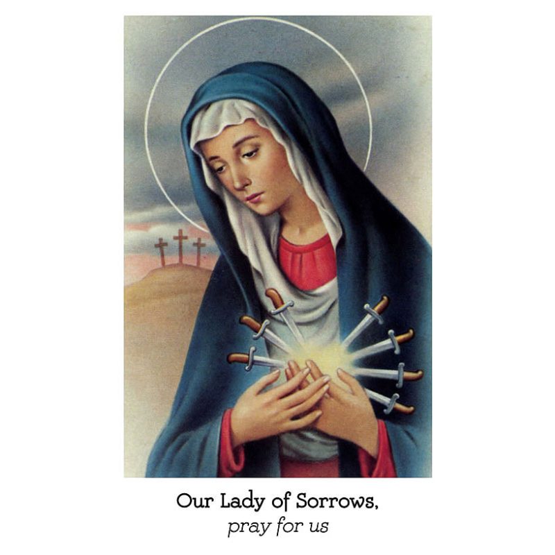 Pack of five front-laminated stampita of Our Lady of Sorrows features a picture of the Mary on the front. Text on the back reads: Father as your Son was raised on the cross his mother Mary stood by him sharing his sufferings. May your Church be united with Christ in his suffering and death and so come to share in his rising to new life where he lives and reigns with you and the Holy Spirit one God forever and ever. Amen.