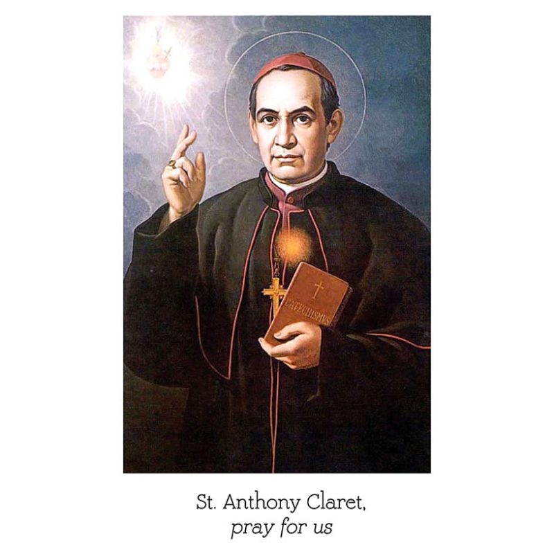 Pack of five front-laminated St. Anthony Mary Claret stampita. It features a picture of the saint on the front. Text on the back reads: St. Anthony Mary Claret during your earthly life you often comforted the afflicted and showed tender love and compassion for the sick and the sinful. Intercede for us now and obtain through the powerful intercession of the Immaculate Heart of Mary the grace we yearn for so ardently (mention the special grace). Amen.Our Father Hail Mary Glory Be